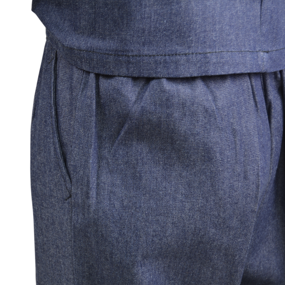 100% cotton, in a soft, light-weight denim material which balances comfort with durability. This Samue set consists of a comfortable, wrap over style jacket with internal fastening ties and drawstring waist trousers complete with pockets and fold over ankle ties.