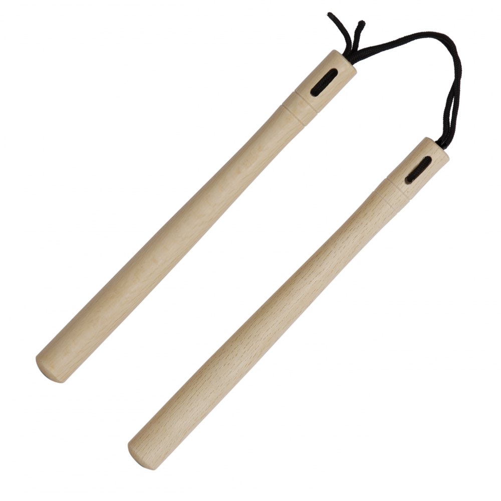 White oak round Nunchaku with rope connector. Tapered 2.9cm diameter available in 12" (30.5cm) and 14" inch (35.6cm) lengths.