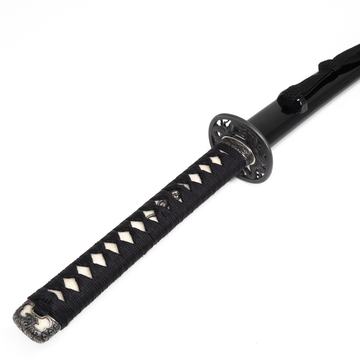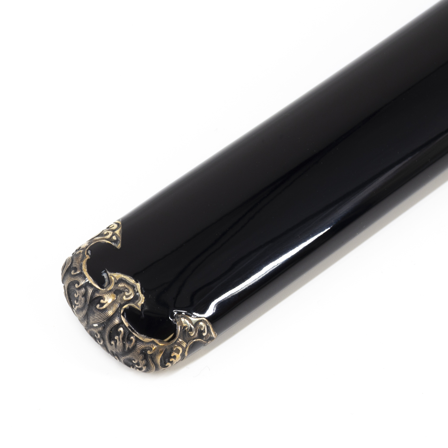Gloss Black Saya with Kojiri - A sleek, mirror-like lacquered scabbard that combines elegance with durability, complete with integrated silver Kojiri for added aesthetic harmony.